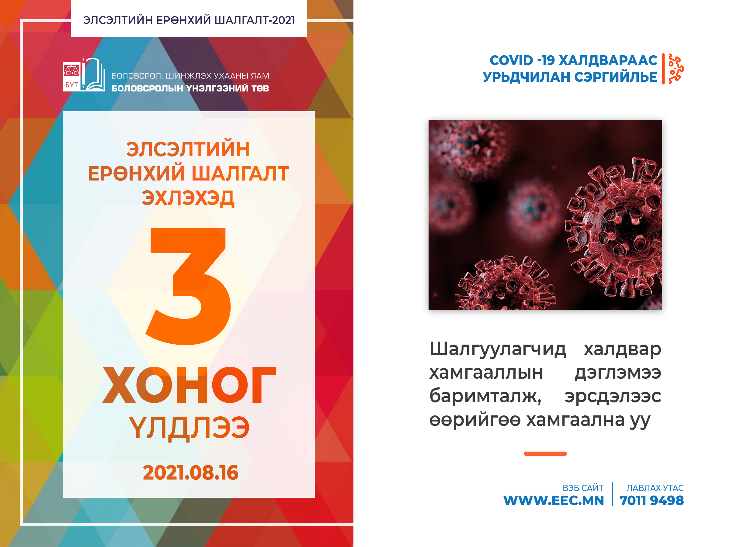 2021 оны Элсэлтийн ерөнхий шалгалтыг 08 дугаар сарын 19-22-ны өдрүүдэд зохион байгуулна. Шалгуулагчид шалгалтад дараах 4 баримт бичигтэй ирнэ.