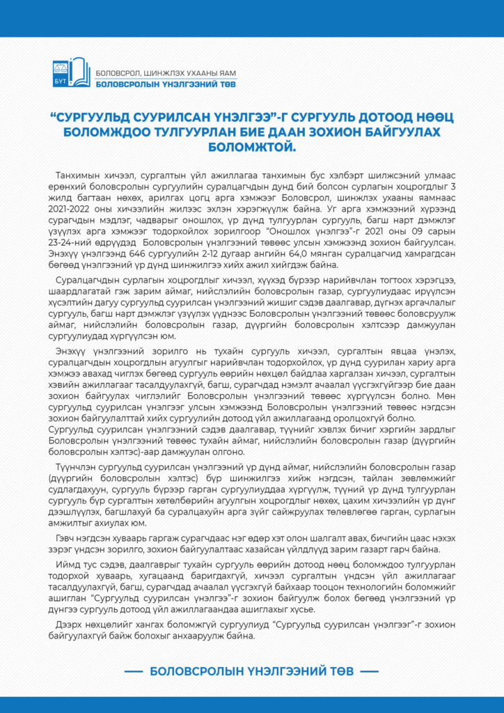 Швейцарын хөгжлийн агентлагийн санаачлагаар хэрэгжүүлж буй ТХБ-II төслийн хүрээнд Боловсрол, Шинжлэх Ухааны Яам болон Байгаль Орчны Яамны харьяа байгууллагуудын хүний нөөцийг чадавхжуулах, тогтвортой хөгжлийн үзэл... Дэлгэрэнгүй