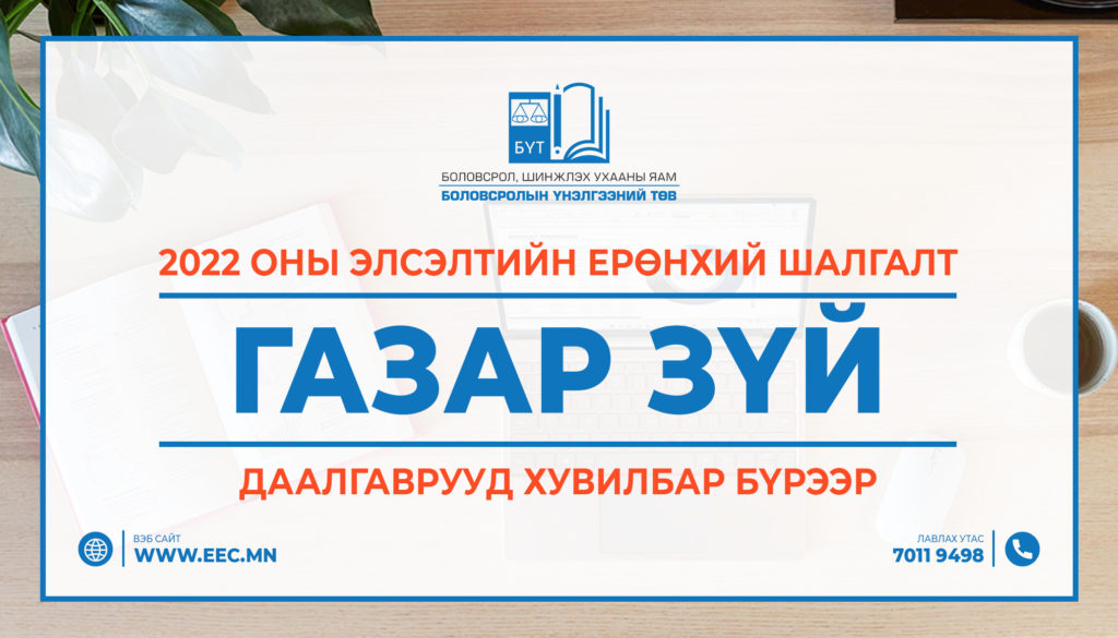 Шинэ элсэгчдэд Read more 2022 ОНЫ ХОЁР ДАХЬ ЭЛСЭЛТИЙН ЕРӨНХИЙ ШАЛГАЛТЫН ЕРӨНХИЙ БЛЮПРИНТ 2022-11-15 / 3638 Дэлгэрэнгүй