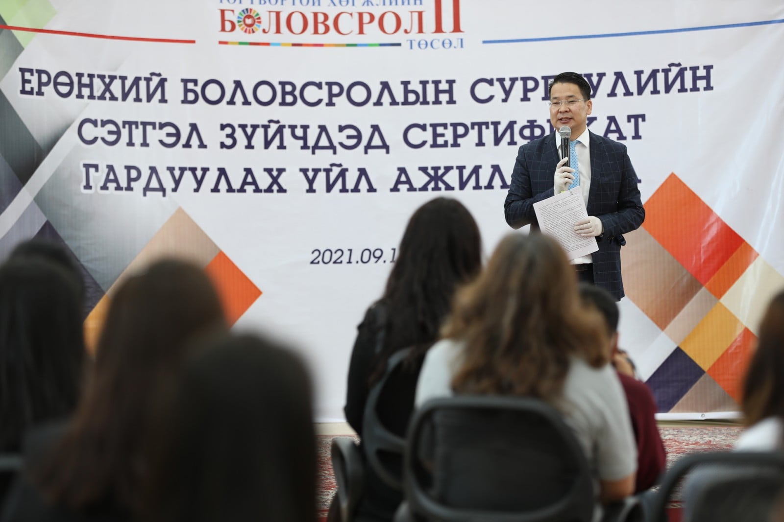 Сургуулийн орчинд ажиллах мэргэшсэн сэтгэл зүйчид ажлын байрандаа очлоо 2021-09-17 /Нийтлэсэнeec.mn / 1721 Боловсрол, шинжлэх ухааны яамнаас 2021-2022 оны хичээлийн жилд онцлон хэрэгжүүлж байгаа ажлуудын нэг нь ерөнхий боловсролын сургуульд сэтгэл зүйч ажиллуулах асуудал байлаа. 2021 оны 3 дугаар сараас ерөнхий боловсролын сургуульд сэтгэл зүйч ажиллуулж эхлэх эрх зүйн орчныг судлах, суралцагч, багш, эцэг эх, асран хамгаалагчдын хэрэгцээ шаардлагыг тодорхойлох, сэтгэл зүйчээр сургуулиудаа хангах богино дунд хугацааны төлөвлөлт хийх, боловсон хүчнээ хэрхэн зөв бэлтгэх, мэргэшүүлэх гээд цогц байдлаар авч үзэж, хэрэгжүүлэхийг зорьсон. Энэ хүрээнд “Тогтвортой хөгжлийн боловсрол II” төслийн түшиц сургуулиуд дээр ажиллах 23 сэтгэл зүйч өнөөдөр сертификатаа гардан авлаа. Мэргэшүүлэх сургалт цаг үеийн нөхцөл байдлаас шалтгаалан 21 хоногийн онлайн сургалт, 14 хоногийн танхимын сургалт, 14 хоногийн мэргэжлийн байгууллагууд дээр биечлэн хийж турших дадлага ажил гэсэн 3 чиглэлээр зохион байгуулагдсан. Мэргэшсэн сэтгэл зүйчид даваа гарагаас хүүхдүүдтэйгээ ажиллаж эхэлнэ. Тэд сертификат гардахаас гадна иж бүрэн сургалтын хэрэглэгдэхүүн, жишиг өрөө тасалгааг хүлээн авч байгаа юм. Ерөнхий боловсролын сургуульд мэргэжлийн сэтгэл зүйч ажиллуулах нь хүүхдийн оюун ухаан, бие бялдрын хоцрогдлыг эрт илрүүлж хөгжүүлэх, сэтгэл зүйн тулгамдаж буй асуудлыг илрүүлэх, бэрхшээлтэй асуудлуудыг шийдвэрлэхэд нь туслах; багш, эцэг эхэд зөвлөгөө өгөх; гэр бүл, сургууль дээр үүссэн зөрчил зөрөлдөөнийг шийдвэрлэхэд нь мэргэжлийн туслалцаа үзүүлэх, ялангуяа хүүхдийг шилжилтийн эмзэг үеэ зөв даван туулахад нь тусалж, элдэв муу зуршилд өртөхөөс нь сэргийлэх зэрэг олон чиглэлээр дэвшил гарч нийгэм бүхэлдээ сэтгэл зүйн хувьд эрүүлжихэд тустай юм. Мөн мэргэжлийн сэтгэл зүйчид ажлын байртай болох сайн талтай. Өнгөрсөн хугацаанд ерөнхий боловсролын сургуулиудад ажиллах сэтгэл зүйчдийг сонгон шалгаруулах, сургуулийн сэтгэл зүйчээр мэргэшүүлэн сургах асуудлыг Швейцарийн хөгжлийн агентлаг, “Тогтвортой хөгжлийн боловсрол II” төсөл, “Бадамлин” нийгэмд үйлчлэх төрийн бус байгууллагын санхүүгийн дэмжлэг, яамны харьяа байгууллагууд, мөн их дээд сургууль, мэргэжлийн төрийн бус байгууллагууд, сэтгэл судлалын чиглэлээр үйлчилгээ үзүүлдэг мэргэжлийн байгууллагуудын сэтгэл судлаачидтайгаа хамтран зохион байгуулсан. Share Post Сургуульд бэлтгэгдсэн байдлыг ... ЕБС-ийн суралцагчдын сурлагын ...