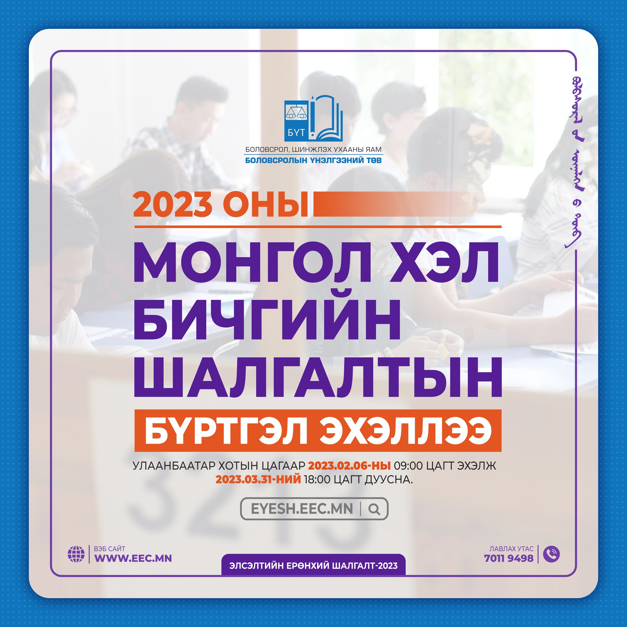 ✅ 2023 оны Монгол хэл бичгийн шалгалтын бүртгэл орон даяар Улаанбаатар хотын цагаар 2023 оны 02-р сарын 06-ны 09:00 цагт эхэлж, 2023 оны 03-р сарын 31-ний өдрийн 18:00 цагт дуусна. Бүртгэл https://eyesh.eec.mn/ цахим хуудсаар явагдана.