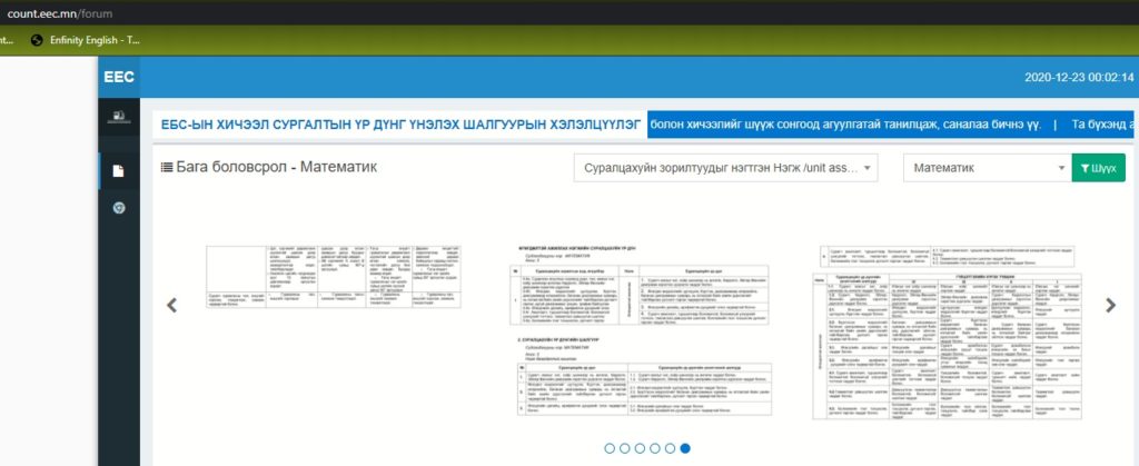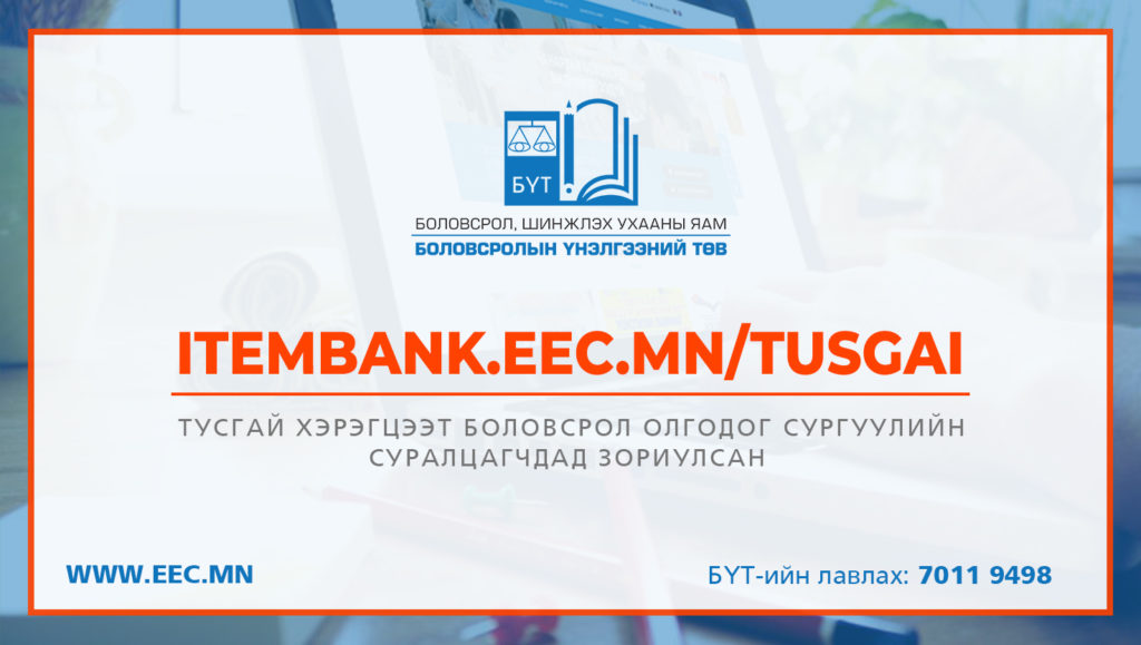 Боловсролын үнэлгээний төвийн http://help.eec.mn/ сайтаас Элсэлтийн ерөнхий шалгалттай холбоотой ТВ хичээл, ЭЕШ зөвлөмж, видео хичээл, жишиг даалгавар, цахим хичээл, мэдээ мэдээлэл, даалгаврын тайлбар, ЭЕШ-ын... Дэлгэрэнгүй