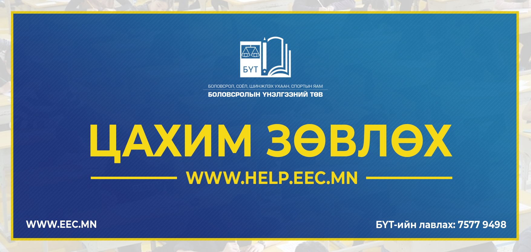 Зөвлөгөөн Read more HELP.EEC.MN 2021-01-29 / 3520 Боловсролын үнэлгээний төвийн “ЦАХИМ ЗӨВЛӨХ” портал сайт http://help.eec.mn нь элсэлтийн ерөнхий шалгалтад бэлтгэж буй Ерөнхий боловсролын сургуулийн 12 дугаар ангийн суралцагчид болон багш нарт... Дэлгэрэнгүй