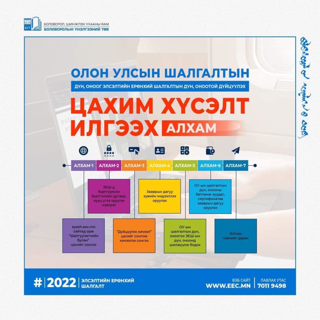 Олон улсын шалгалтын үнэлгээг Монгол улсын ЭЕШ-ын үнэлгээнд дүйцүүлэх хүсэлт, холбогдох бичиг баримтыг нотариатаар баталгаажуулан тухайн жилийн ЭЕШ эхлэхээс хамгийн багадаа 14 хоногийн өмнө https://eyesh.eec.mn/ хаягаар ирүүлнэ. ... Дэлгэрэнгүй