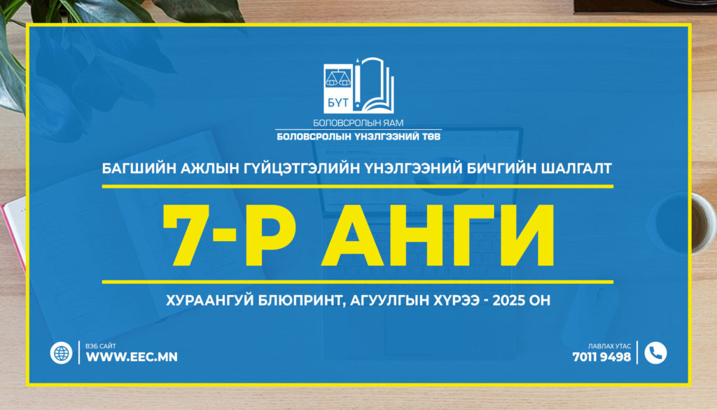 Мэдээ, мэдээлэл Read more “Багшийн ажлын гүйцэтгэлийн үнэлгээ-2025” шалгалтын хураангуй блюпринт /7-р анги/ 2025-04-07 / 17789 “Багшийн ажлын гүйцэтгэлийн үнэлгээ-2025” шалгалтын хураангуй блюпринт /7-р анги/ Дэлгэрэнгүй