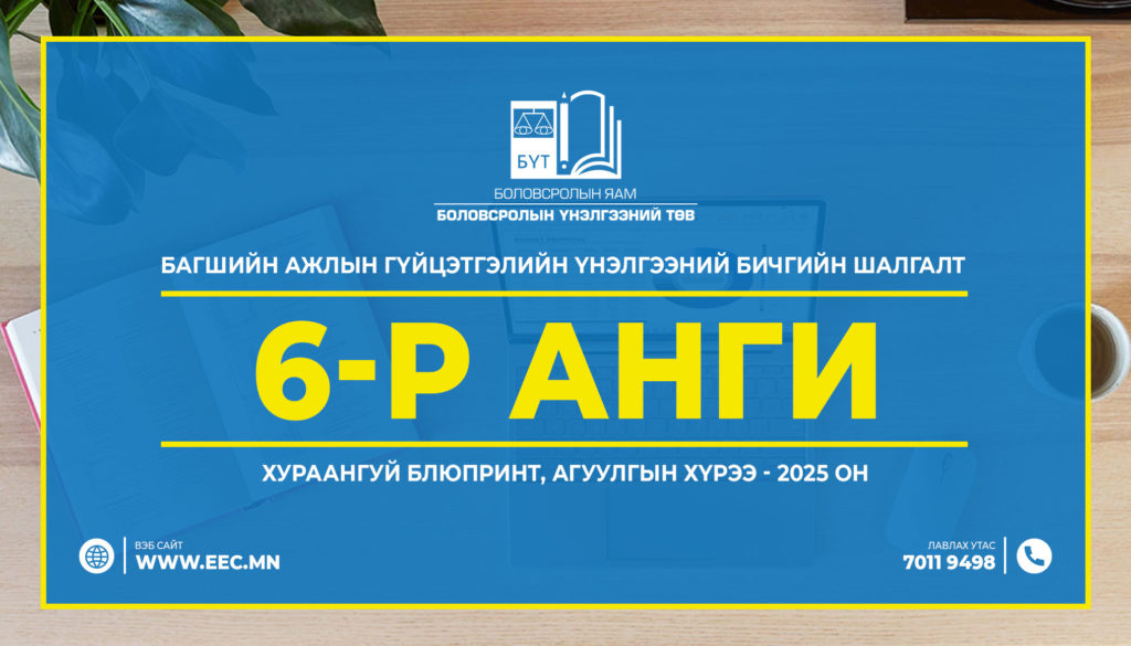 Мэдээ, мэдээлэл Read more “Багшийн ажлын гүйцэтгэлийн үнэлгээ-2025” шалгалтын хураангуй блюпринт /6-р анги/ 2025-04-07 / 14933 “Багшийн ажлын гүйцэтгэлийн үнэлгээ-2025” шалгалтын хураангуй блюпринт /6-р анги/ Дэлгэрэнгүй