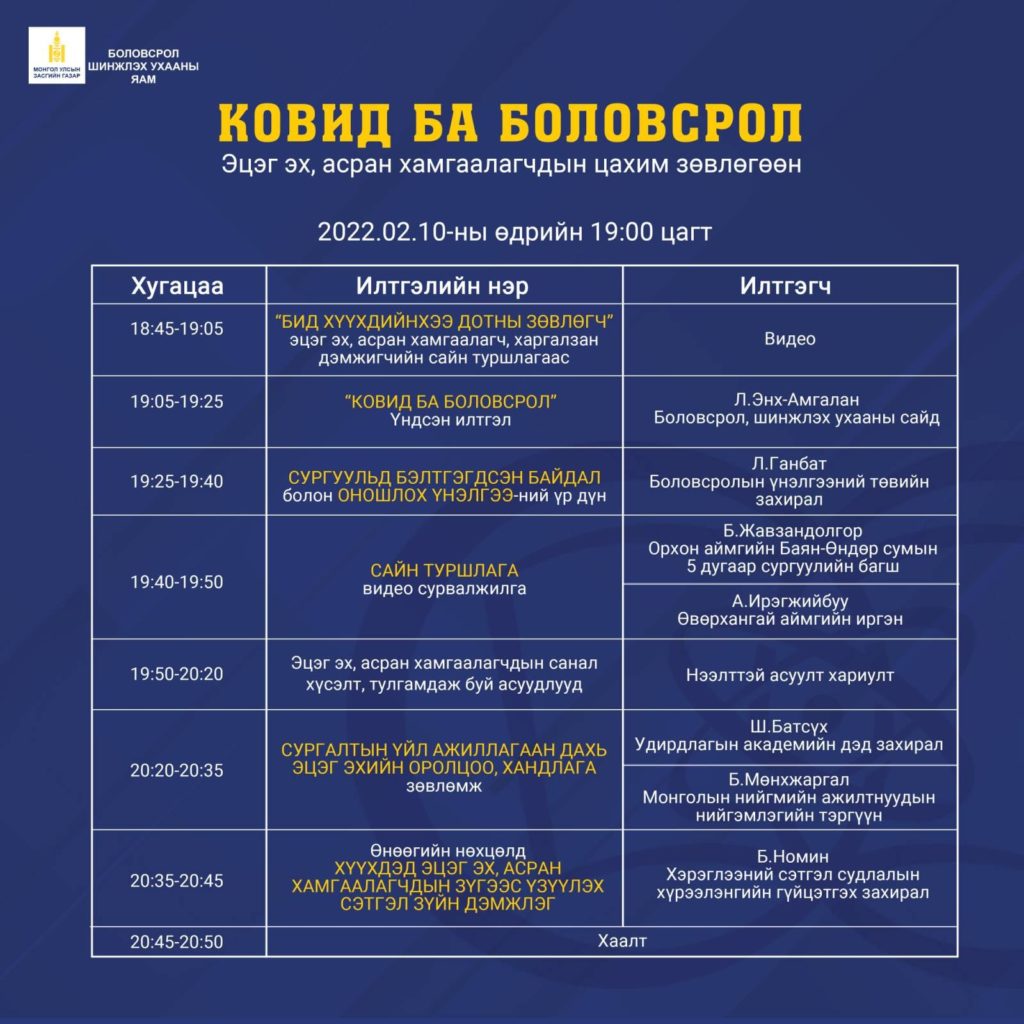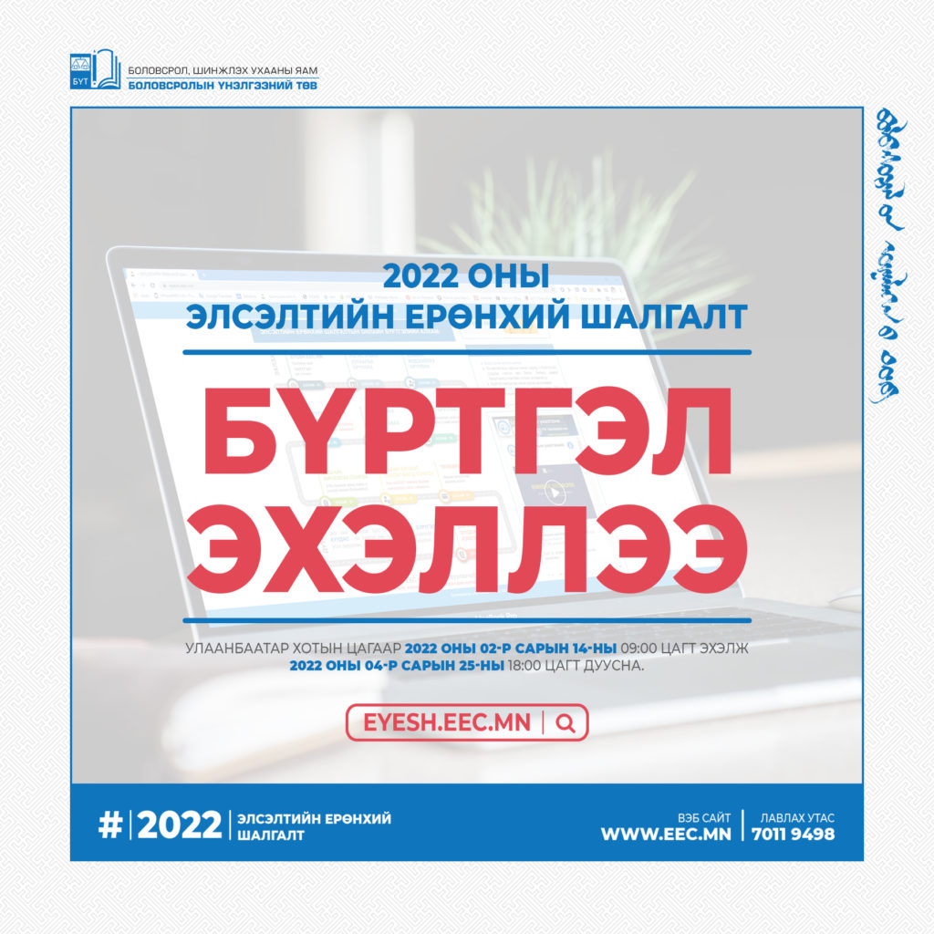2022 оны элсэлтийн ерөнхий шалгалтын бүртгэл орон даяар, Улаанбаатар хотын цагаар 2022 оны 02-р сарын 14-ний өглөө 09:00 цагт эхэлж, 2022 оны 04-р сарын 25-ны... Дэлгэрэнгүй
