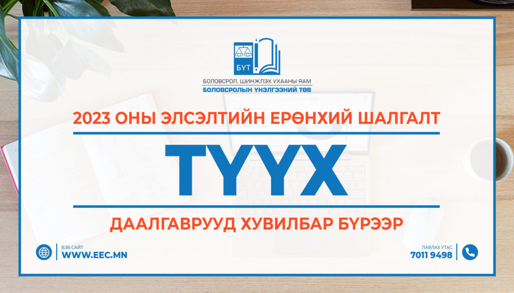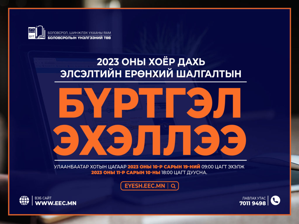 Та бүхэнд ЭЕШ-ын бүртгэлийн алхам, бүртгэлийн явцад анхаарах зүйлсийн талаар зөвлөгөө, зөвлөмжийг хүргэе. ЭЕШ-ын шалгуулагчдын онлайн бүртгэл www.eec.mn цахим хуудсаар, орон даяар, Улаанбаатар хотын цагаар 2023 оны 10... Дэлгэрэнгүй
